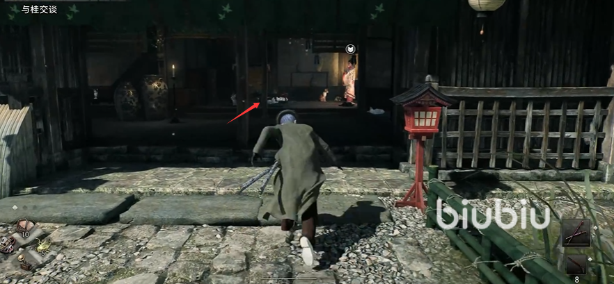 接下来直接传送到西本愿寺,进来后一直往角落走,路上就是炮击训练了,但是先去角落找猫。从最里面的厕所有梯子可以上房,然后跳到前方较大的房顶,走房顶右侧,走到近处就会发现这里有一个洞。
