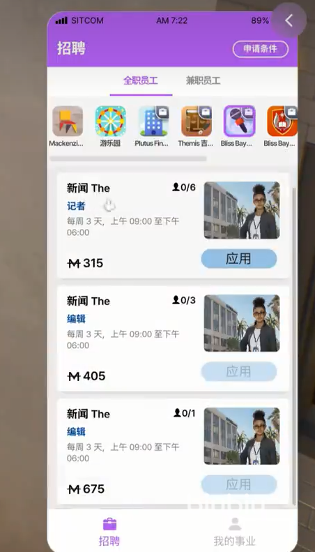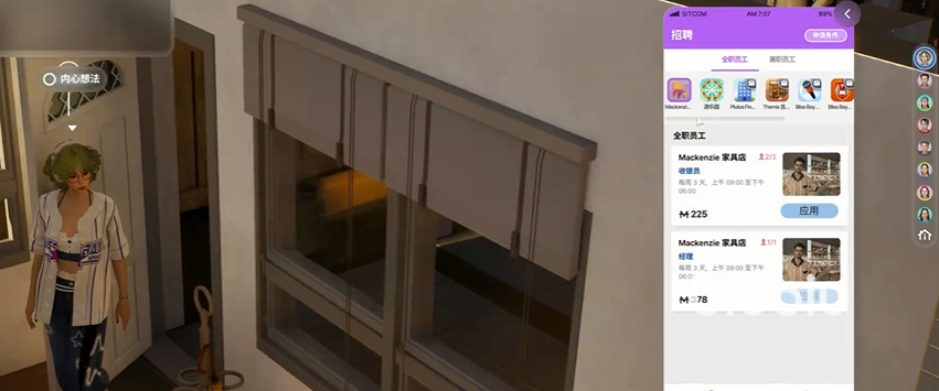 首先可以选择学生或者招聘工作,如果是学生的话就会分为小学、中学、高中、大学,大学可以选择的专业也是很多的,工商管理、计算机科学、多媒体艺术等等。而职业就在招聘网站里了。各个行业下有又有具体的工种不同。比如家具店员工(收银员和经理)、游乐园员工(办公室职员、办公室组长、现场员工、收银员)、Aura集团(实习、分析师、投资组合经理),还有本次试玩版新增的职业,律师。