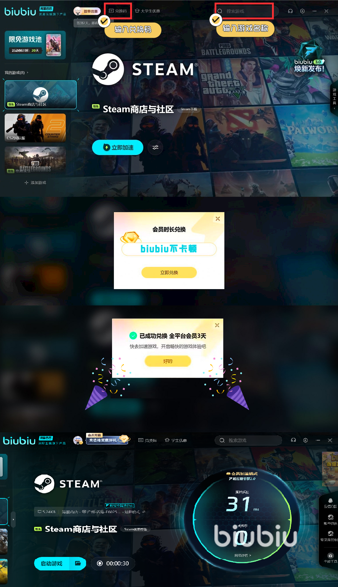 biubiu加速器还推出了阶梯式福利体系。新注册用户即可领取3小时全端加速时长,支持同时加速PC、主机等多种设备。输入兑换码【biubiu不卡顿】,所有用户均可再享3天加速时长,且可与新用户福利叠加使用。