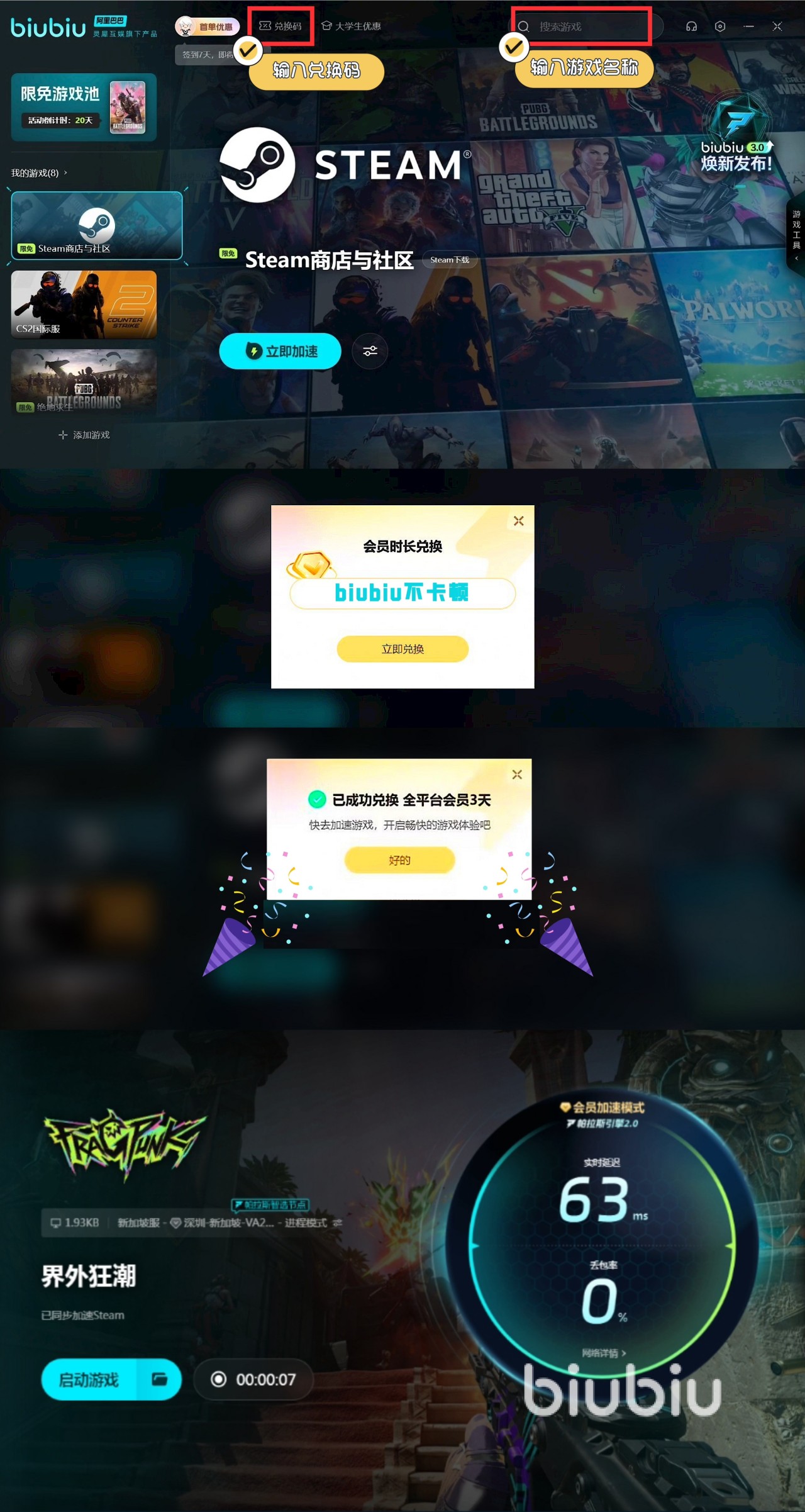 上方给大家提供的加速器是有不少福利的,比如新用户登录注册的话会有3小时的免费加速时间,后续如果大家觉得体验时间不够还可以再用biubiu不卡顿去到手三天的加速时长。
