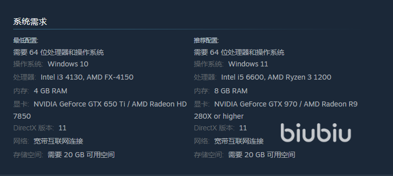 我们现在登录steam就能查找到游戏页面了,可以看到配置要求写的很清晰了,最好达到推荐配置,处理器用i5-6600,然后显卡用GTX970,存储内容达到20GB就好了,这样开启中等画面都没什么问题的,而且这个配置已经算要求很低了。