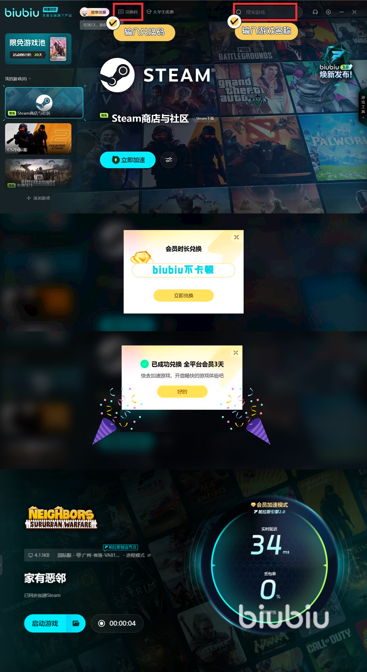 当下用给出来的福利超级多的,新手有3小时的使用时间的,然后用【biubiu不卡顿】吧,给新老用户送来的可就是额外的72小时使用时间了,都领取,新手可以用到75小时的,这些用来下游戏,玩游戏都很充足的。
