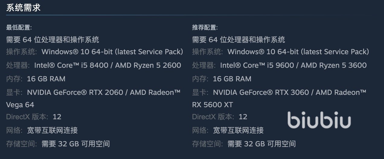 从官方公布的配置要求来看,该作对硬件的要求并不算低,尤其是显卡方面,最低配置要求至少是RTX 2060或Vega 64显卡,这意味着如果你的电脑配置不够,可能会在游戏中遇到卡顿、掉帧等问题,影响游戏体验。更详细的内容请看下图: