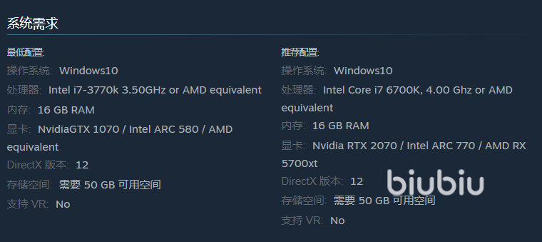 这款游戏对配置的要求主要是处理器需要i7以上,显卡不算太高,GTX1070目前算是最优性价比的老卡之一,毕竟是2016年出的了,至今仍然能发光发热,其次是内存方面,最低和推荐配置均为 16GB,存储空间需要50个G以上。其他没有特殊要求了,因此配置还是蛮亲民的。