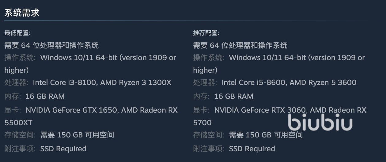 该作的PC配置要求较高,尤其是对于高画质和高帧率的体验。最低配置为Windows 10(版本号>1909)、AMD Ryzen 5 1500X/Intel Core i7-4770K处理器、16GB内存、AMD Radeon 470/NVIDIA GTX 970/1050 Ti显卡(4GB显存)、100GB固态硬盘;更多要求大家参考下图:
