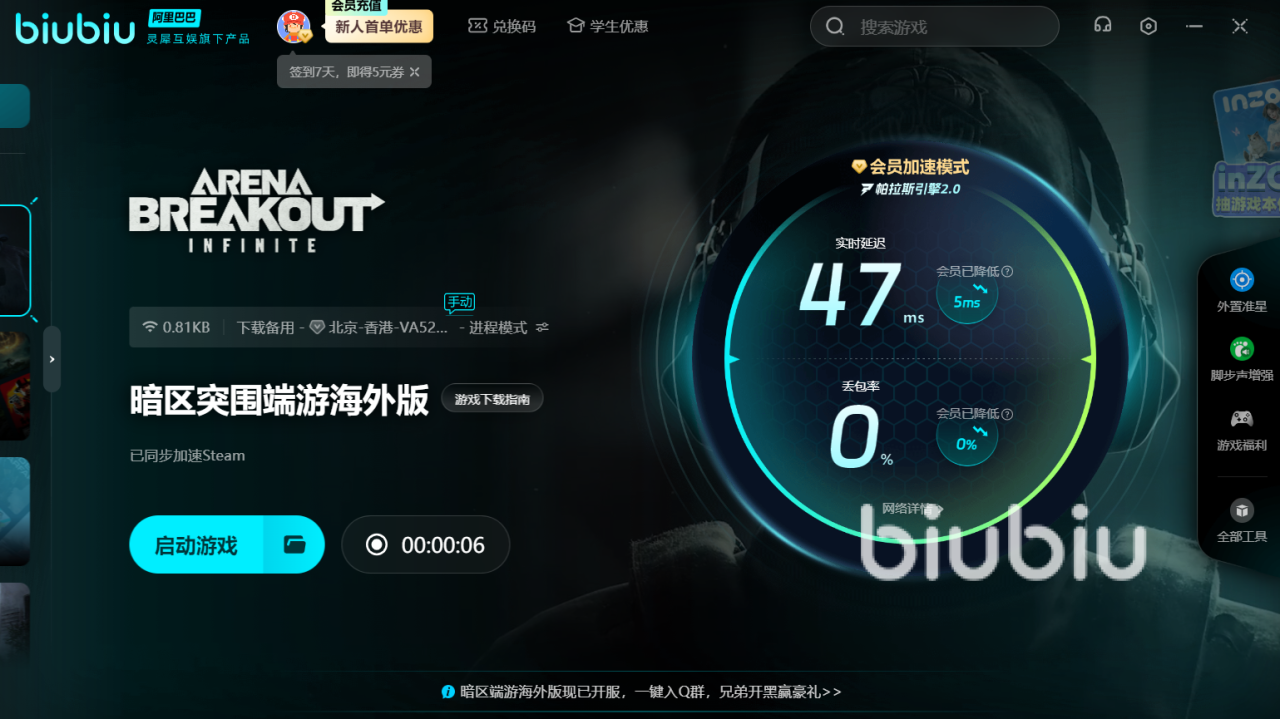 现在输入暗号【biubiu不掉线】可领取3天VIP加速时长,首次注册更是额外赠送3小时,叠加总计75小时免费加速,足够覆盖抢先体验期。还能覆盖Steam、WeGame等平台,一键加速无需复杂设置。