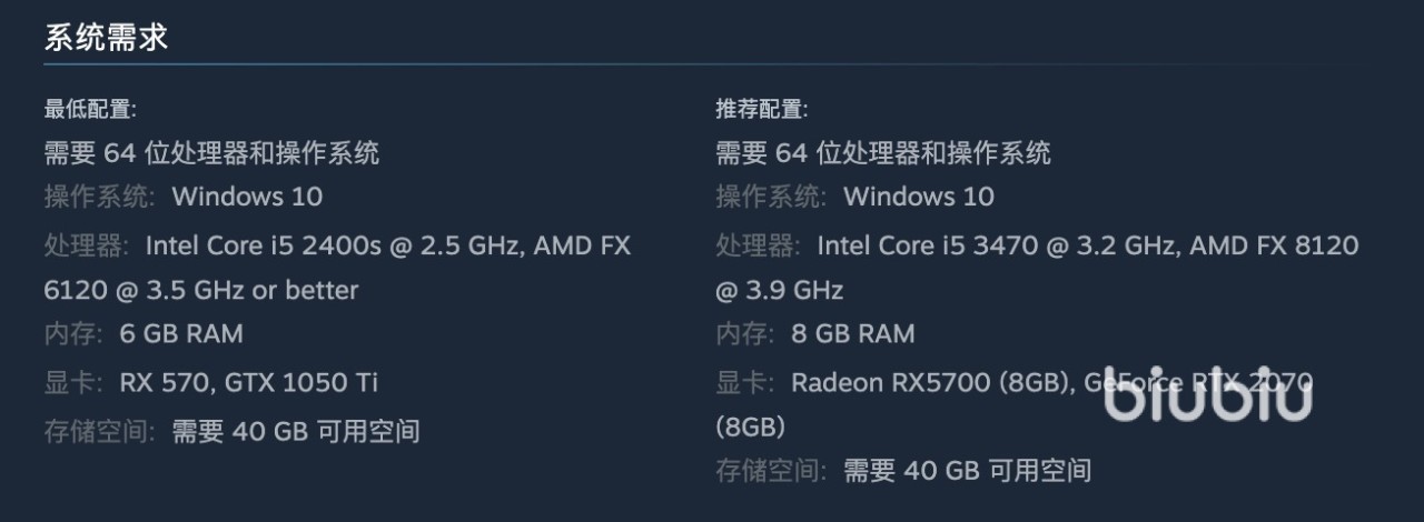 这款游戏的配置并不高。最低配置要求为:需要64位处理器和操作系统,操作系统为Windows 10;处理器可选Intel Core i5 2400s @ 2.5 GHz;显卡可选RX 570或GTX 1050 Ti;存储空间需满足40GB即可。想了解更详细的信息看下图就明白了: