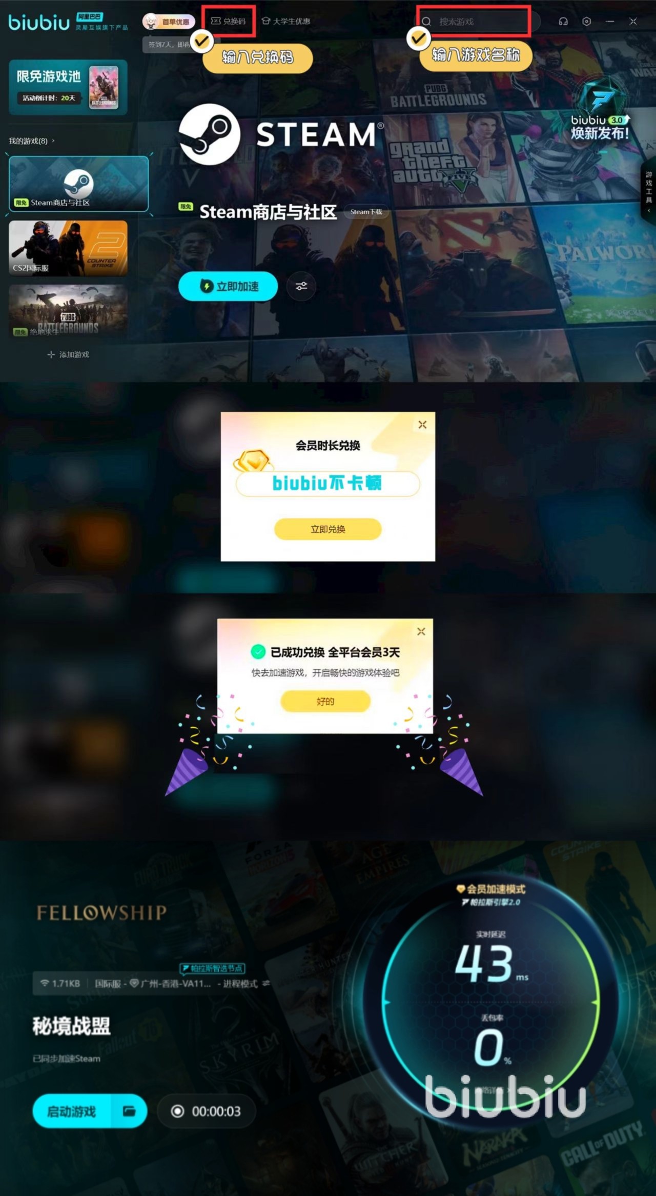 接着就是内存要求8g以及硬盘的空间要求为20g,这个配置要求也是比较低级的,所以想要游玩的玩家基本上不会因为配置问题劝退,有些玩家配置很好,但玩起来就是卡顿,ping率经常999,这主要是网络问题导致的,可以使用biubiu进行加速,同时新人在注册后便获3小时免费加速,且新老用户均可使用兑换码【biubiu不卡顿】可获3天免费的使用权哦!
