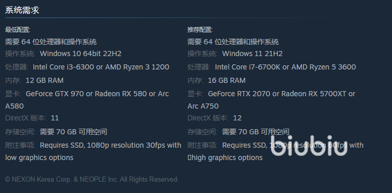 这是跟地下城与勇士有相同世界观的,不过时间线提前到800年前。游戏画风采用的是平面风格,配置要求其实没有那么高。低配只需要拥有i3-6300处理器以及GTX970显卡,就可以带得动游戏了。