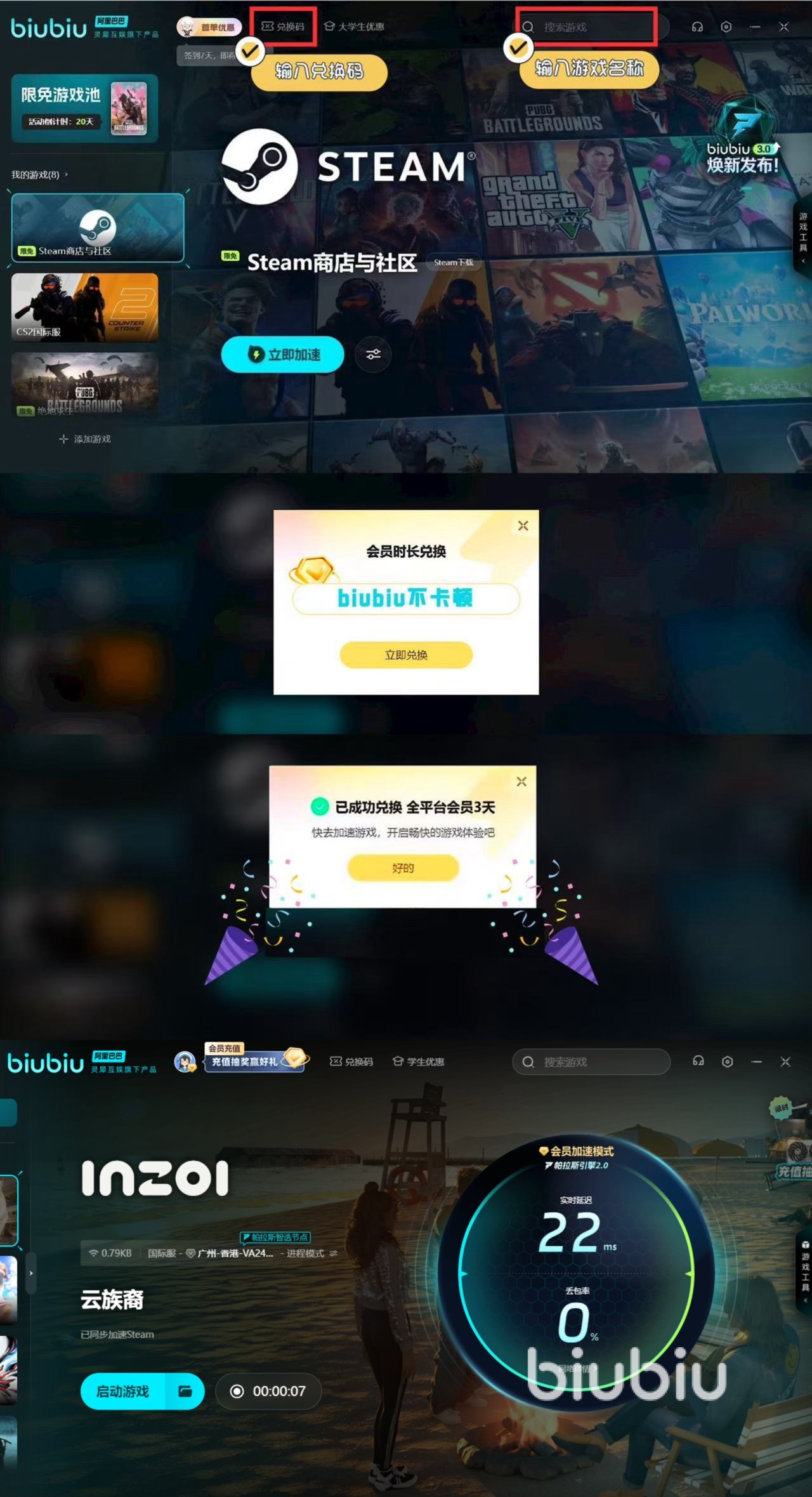 如果大家想注册的话,先需要使用上biubiu。因为只有加速过后才能进入他的注册页面,我们在登录页面机注册即可,根据上面所描述的内容注册好账号和角色啦!新用户的话,可获得3小时的免费加速。另外新老用户输入【biubiu不卡顿】,就能额外领取三天免费加速。