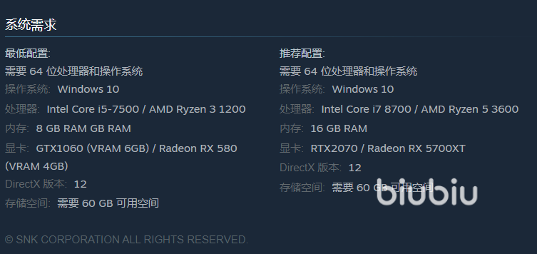 根据steam页面内官方公布的信息来看,本作需要i5以上处理器,最低8G内存,60G以上存储空间即可带的动了,因此整体来看,都是些目前主流的中低端水平,配置要求十分亲民。比较需要注意的就是包体较大,有60多G。