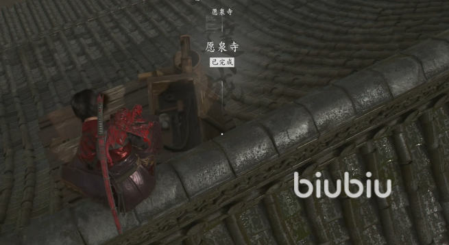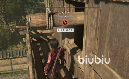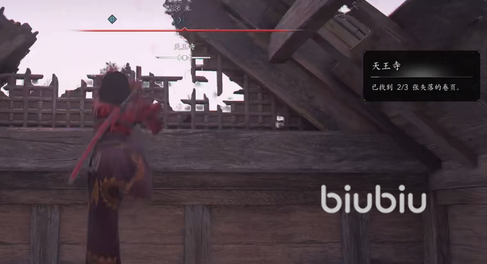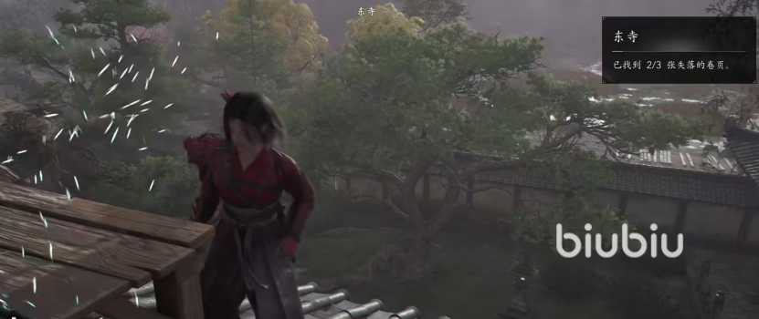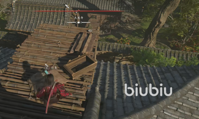 瞭望点出发,然后往寺庙方向走,看到断了一半的屋子,跳上去在梁上可以找到。