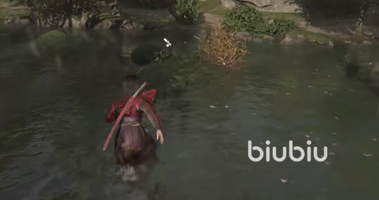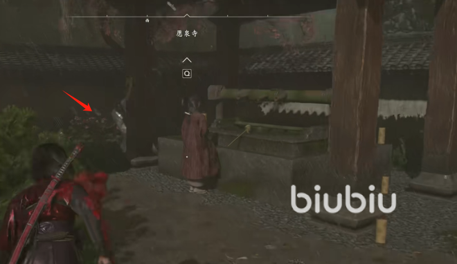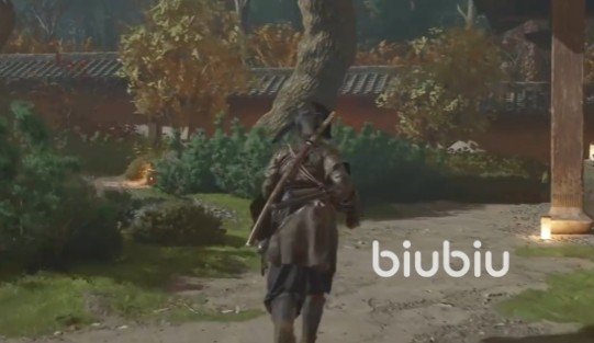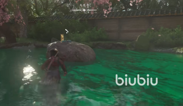 落地之后就能看到有个人站在亭子旁边,左边太湖石以及花丛中就是可以收集的道具了。