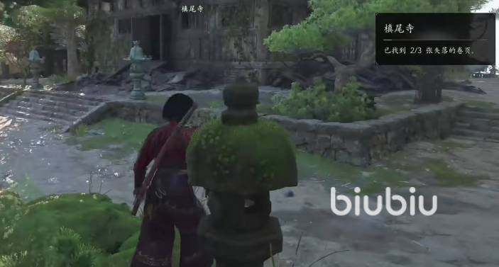 然后左转,找到一个长着青苔的石灯,靠近即可收集。