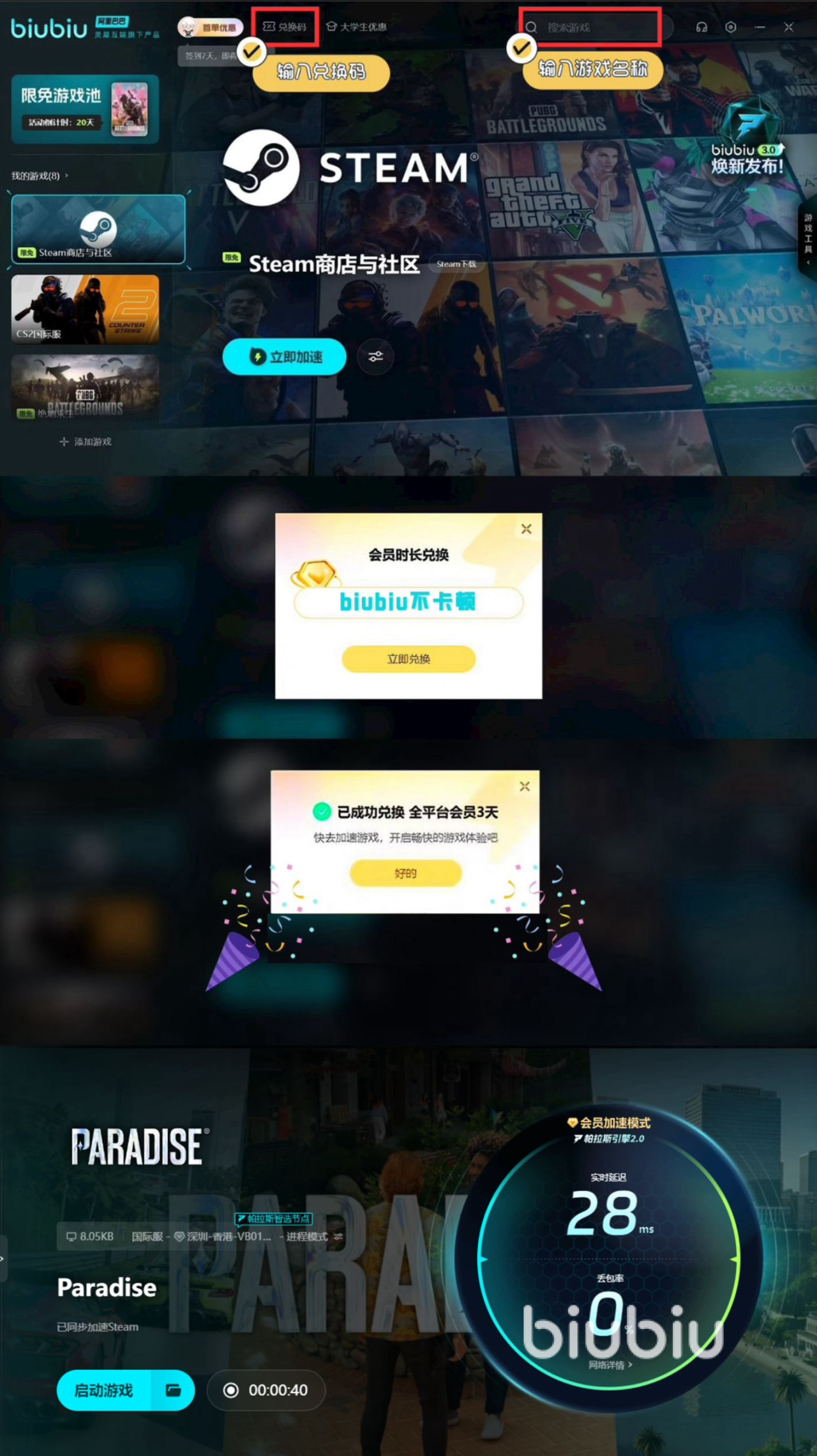 最后就是小编要给大家分享的这款超级好用的加速工具了,不仅可以有效的解决网络所出现的干扰以及延迟等问题,还推出了很多的福利,新老用户的都可以享受,比如【biubiu不卡顿】直接就能兑换到72个小时的加速时间,此外新人的注册还可以领到3h免费体验权限哦。