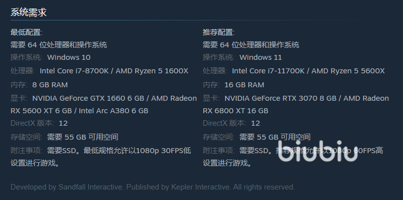 《光与影:33号远征队》作为一款采用虚幻5引擎打造的次世代JRPG,其配置要求属于中等偏高,对硬件性能的优化较为合理。