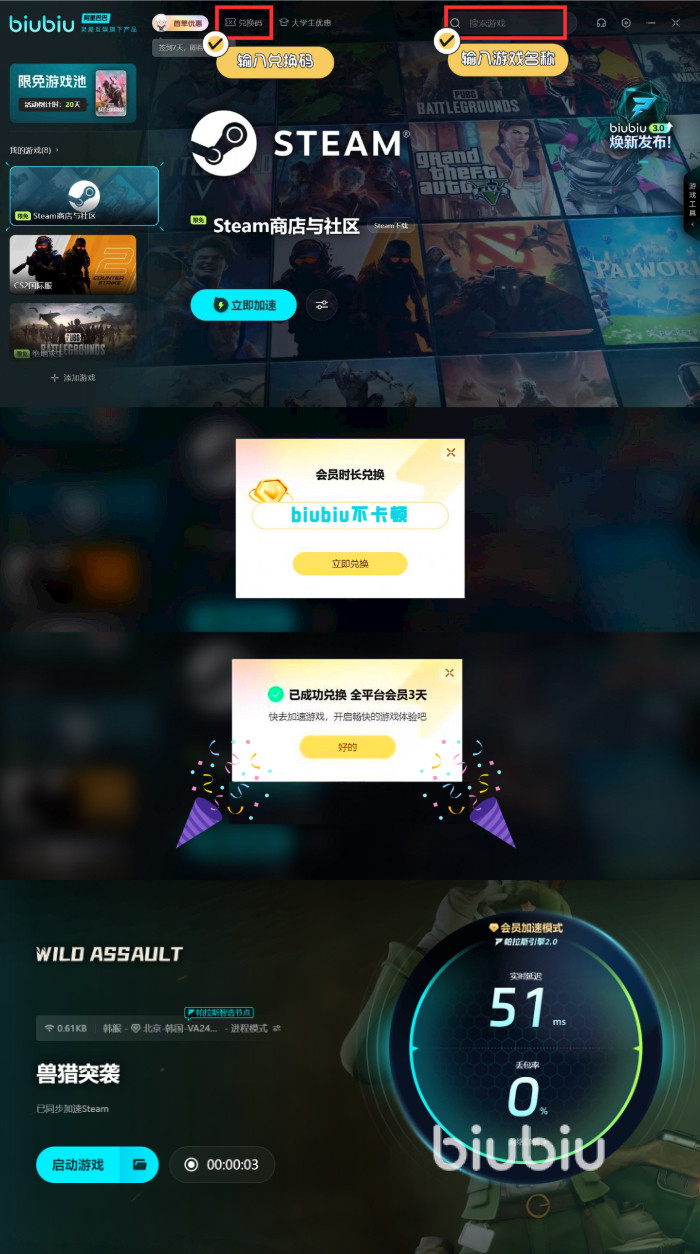 而在解决硬件和软件问题的同时,稳定的网络环境同样至关重要。在这方面,biubiu加速器凭借其卓越的智能调度技术成为了不少玩家的首选。biubiu加速器可以智能选择最佳加速节点,显著降低网络延迟和丢包率,从而保障在线游戏过程中的稳定连接。对于新用户来说,只需登录即可免费获得3小时的会员加速体验;而老用户只需复制兑换码【biubiu不卡顿】,即可领取72小时的额外加速时长,两者累计总共可享受75小时的免费加速福利。这一贴心举措不仅能够帮助玩家在游戏中应对网络不稳引发的黑屏闪退问题,还能大大提升下载速度与游戏流畅度,让每一次战斗都更加畅快淋漓。