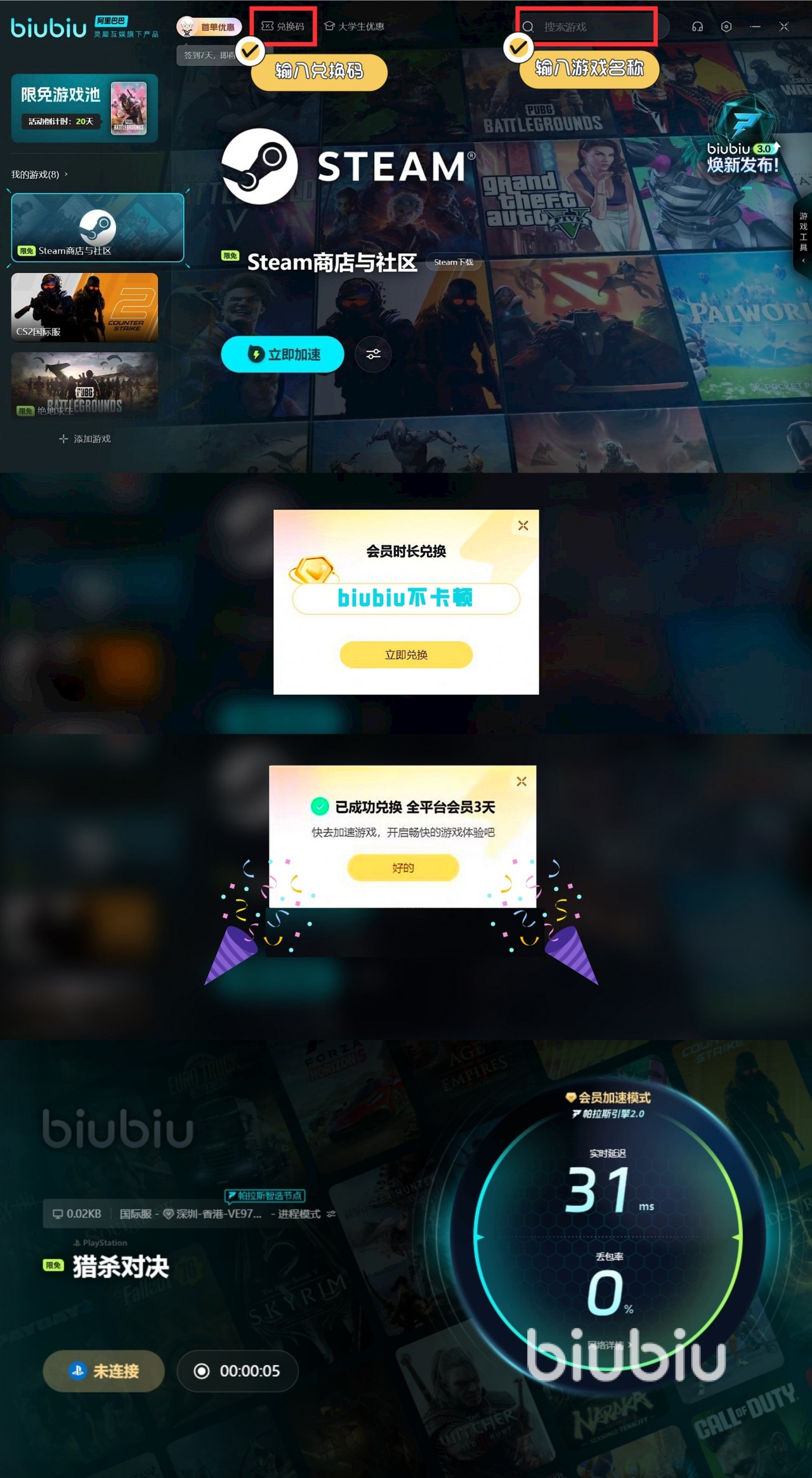 若是各位希望到时能解锁更多加速时长,那么还可主动去点击界面中的兑换,然后利用口令【biubiu不卡顿】,如此所有平台用户都能获得72h的加速机会,这个也是不容错过的。