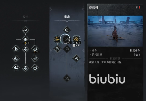 最适合新手使用的武器,前期的核心技能是3个,连环突刺,最基础的重击技巧,不断向前突进伤害敌人。螺旋刺,旋转长枪,汇聚力量刺击目标。逐影挥刺,轻击,闪避攻击,枪杆回击还有连环突刺的时候使用右键,就可以用长枪穿刺前方的敌人,敌人进入失衡状态,再次按下右键,就可以跟敌人互换位置,然后移动到它身后,如果敌人不是失衡状态,就是挥刺攻击。