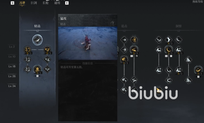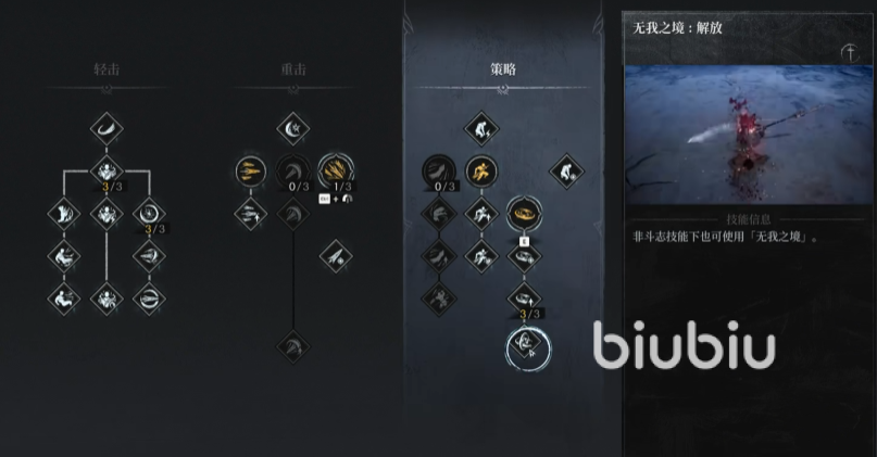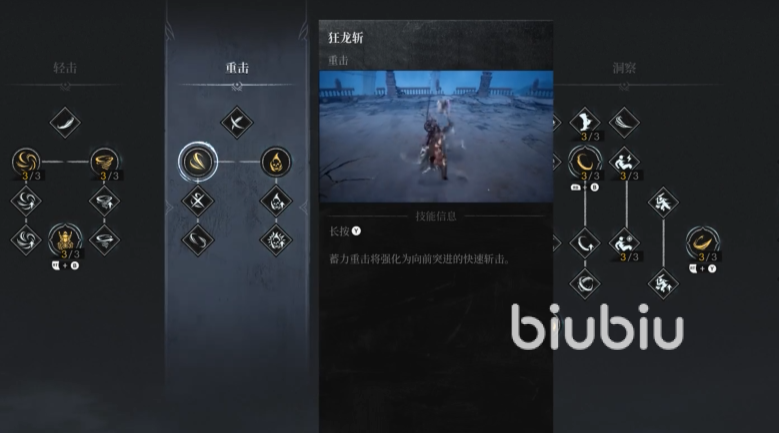 用它的时候记住,必须要精防才可以反斩,不然打出来的伤害就是普通平a了。前期主要用的技能就是猛攻了,可以连续进攻。然后就是怒啸狂袭,可以轻击,重击进行切换进攻敌方,然后使用鬼神:剑舞技能进行强化,可以让幽魂跟我们一起进攻。中期学习狂龙斩就是快速斩击了,突进之后打出来的伤害还是挺高的。