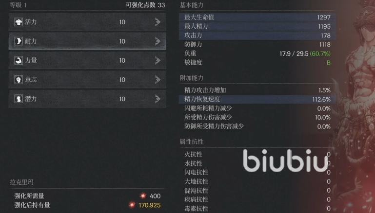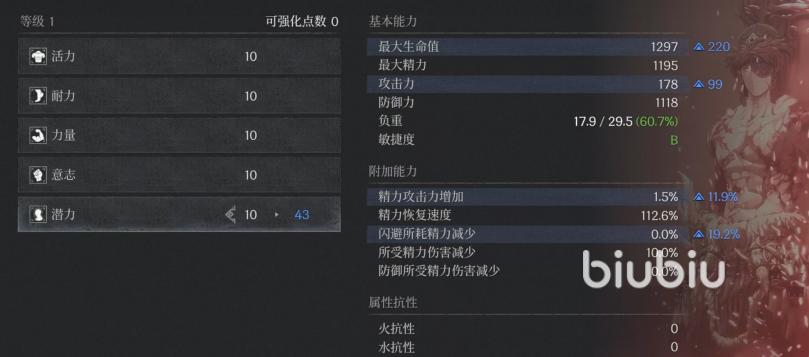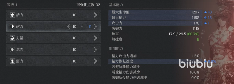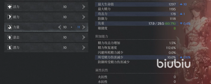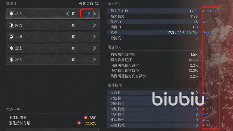 活力其实就是血量,可以看到加1点,我们的血量就会增加50,同时抗性也会有提升,是4点,攻击力增加1点,同时负重会降低0.2%。但是到30就是一个区间,这个加成就变成了一点加40了,相应的攻击力以及抗性的加成比例也会降低。