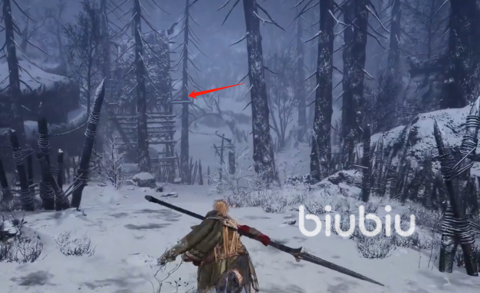 先从悬崖上面的木屋进来,往前一直走到悬崖边上,往下跳沿着小路走,然后爬上阶梯,上来在布旁边就能看到了。