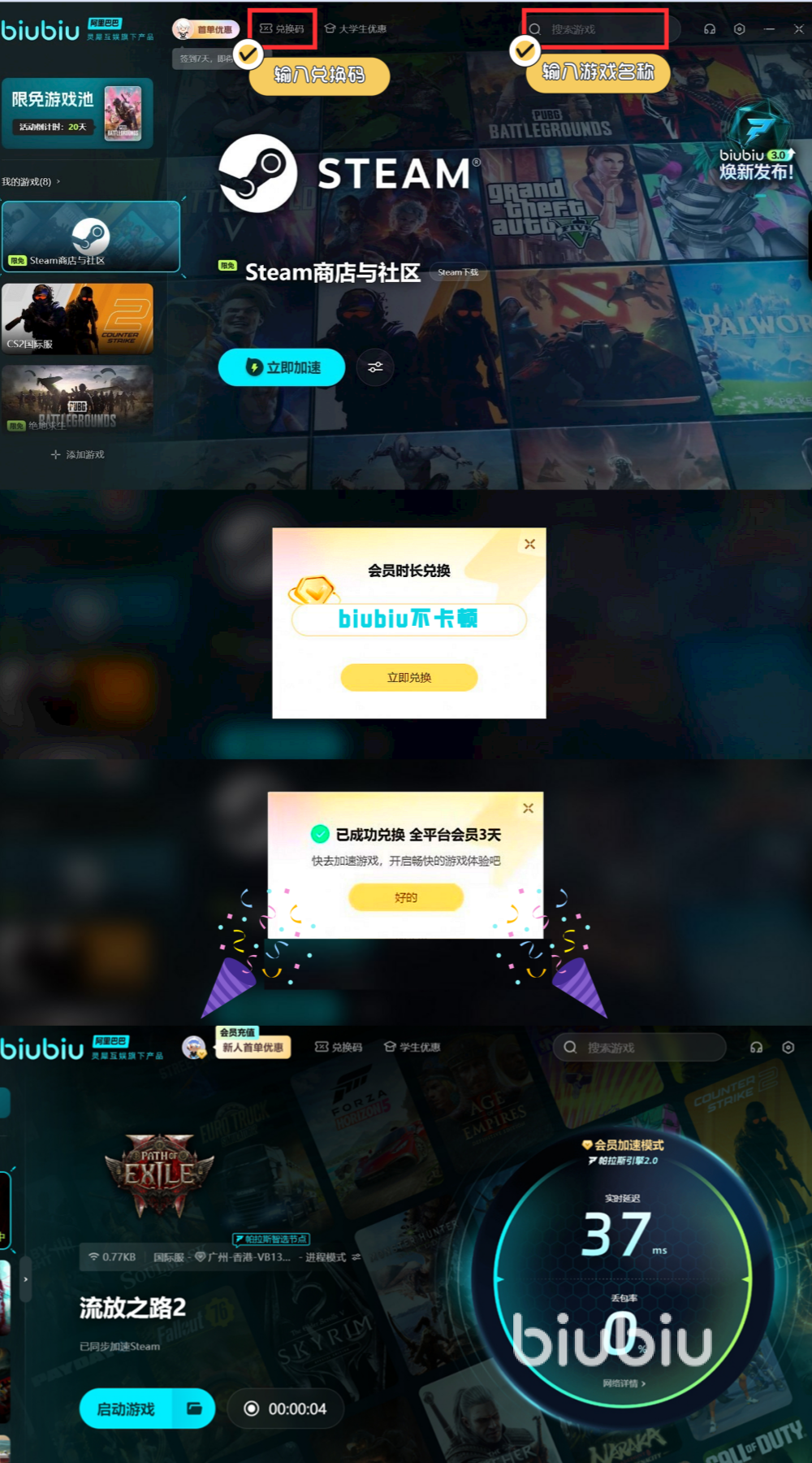 若是玩家希望能解锁更多加速时长,让自己去长时间体验的话,那么只需在兑换界面中主动输入【biubiu不卡顿】,如此一来所有平台用户均可去顺利领取到72h的加速福利哦。