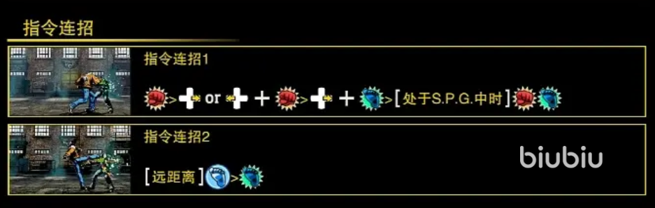 今天主要介绍特瑞·博加德的出招,指令连招1是重拳+右键或者左键+重拳接向右,然后接重脚,此时处于spg状态中,再用重拳跟重脚伤害很高的。要是在远距离状态,可以用连招2,使用轻脚加重脚。