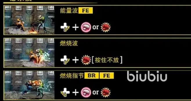 必杀技的连招也有,能量波是用有假动作的技能,然后下转上,接轻拳或者重拳,燃烧波是下转上,然后重拳按住不放。燃烧指节则是用可以中断或者假动作的技能时,可以下转上接重拳或者是轻拳都行。