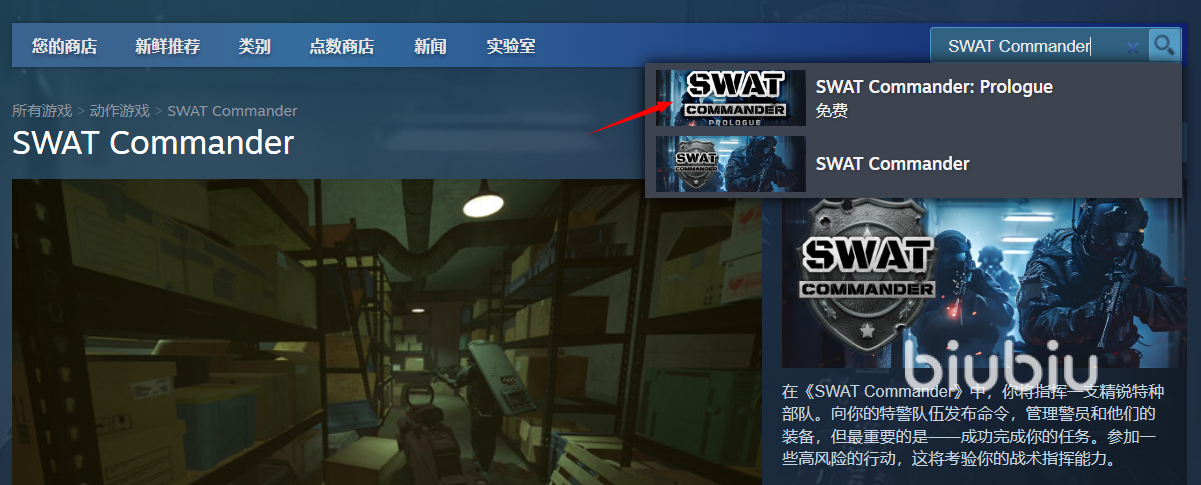 《特警指挥官:序幕》在steam上的名字叫做《SWAT Commander: Prologue》,直接复制这个英文到steam中搜索即可,等待1、2秒就能看到该游戏的预览了,注意该作上架了两版,上面这个免费的是只有序章,目前已经开放下载了,而另一个是完整版,暂时还没有公布具体价格和上线时间,各位不要找错了。