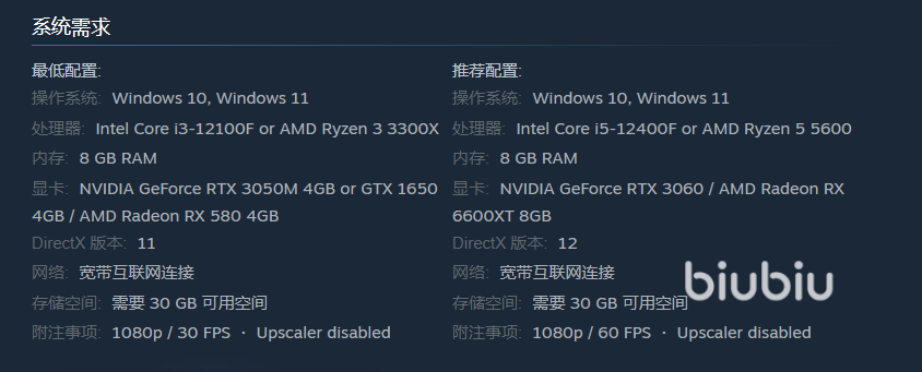 下图中就是该游戏的最低配置与推荐配置,可以说对系统是没有多少要求的,基本上市面流行的中低端电脑都能满足,显卡有一些要求,需要GTX 1650(或相似配置)及以上,但是该配置也并不很高,如果你的设备能带动其他3A游戏,那本作就绝对不在话下的。注意存储空间需要30G,包体不算小。