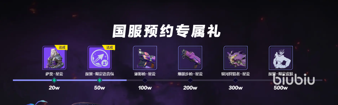 不过目前已经有了将近80万人预约,如果能够达成下面的预约目标,还可以开启国服预约专属礼包,包括萨莫星云、探景限定语音包、逐影枪、爆能步枪、银河狩猎者、探景限定皮肤,最终目标是500W人。