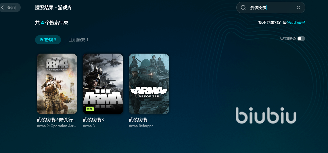 武装突袭3闪退解决办法告诉大家了,不管是哪种方式,biubiu都是好帮手。不光是玩战争类游戏,有的还喜欢玩小游戏类型,比如派对类的,好玩游戏千千万,好在biubiu的库存这么庞大,搜索一下即可,都可以让它为我们服务的,把领取到的福利给利用上。