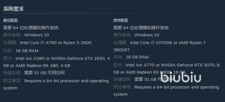 根据目前官方透露的信息,游戏在4K/60帧下的推荐显卡为RTX 3070或AMD RX 6800,这意味着,如果你想要在高画质下流畅体验游戏,一块中高端的显卡是必不可少的。游戏的最低配置至少需要GTX1650或是RX480,I7的处理器是通用的需求,考虑到魂系游戏通常对硬件有一定要求,建议大家至少准备一台中等配置的电脑。