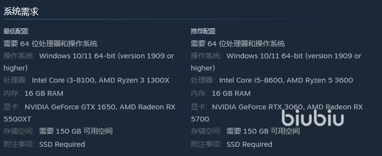 游戏最低配置为I3处理器、16GB内存、GTX 1650的N卡或RX5500XT的A卡,需预留150GB存储空间。推荐配置升级至Intel i5处理器、NVIDIA GTX 3060/AMD RX 5700显卡。且虚幻5引擎对多核心优化有限,更依赖单核性能,若设备低于最低配置,建议降低分辨率至720P并关闭抗锯齿。