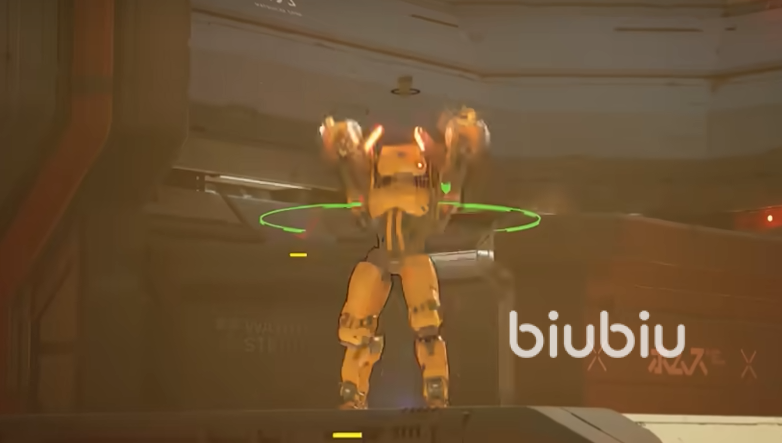 平台怪物清理之后,往左边走,会看到空中漂浮着红色的光圈,进入战斗范围之后,它就会启动,降落下来一个黄色机器人。这个怪物速度快,攻击强,后退着打比较安全。