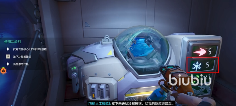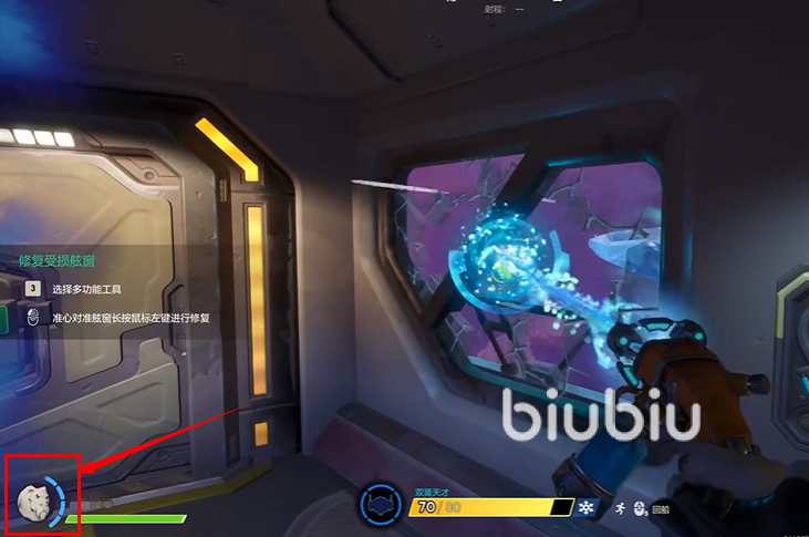 飞船维护:飞船受损(如着火或氧气泄漏)时,需使用修理工具(默认按3键切换)扑灭火焰或修复漏洞。氧气值(下图中蓝色标记)会随时间减少,需及时修补破损窗口以恢复氧气供应。