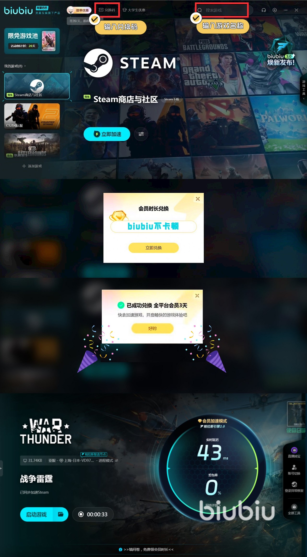 ①在下载与登录方式上。Steam服玩家需要通过Steam平台下载并安装游戏,登录时使用Steam账户。国际服玩家可以直接从战争雷霆的官方网站下载并安装游戏,登录时使用在官网注册的账户。同时,为了让大家的安装更稳定,大家可以点击上方链接实现Biubiu加速器的一键安装,这个加速器中的新用户专享24小时免费网络优化体验。通过兑换码【biubiu不卡顿】,大家还可额外获得72小时加速时长,彻底告别卡顿延迟!