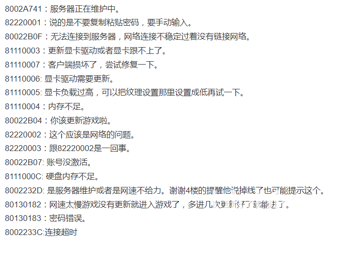 很多时候,我们硬性条件不足,都会有详细代码提示我们的,显示8002A741代表服务器还没维护完成,要是81110007就是客户端文件受损需要修复一下,81110006是代表显卡驱动要更新了,后缀05则是提示显卡负载过高,要不换配置,要不调低设置就行了。