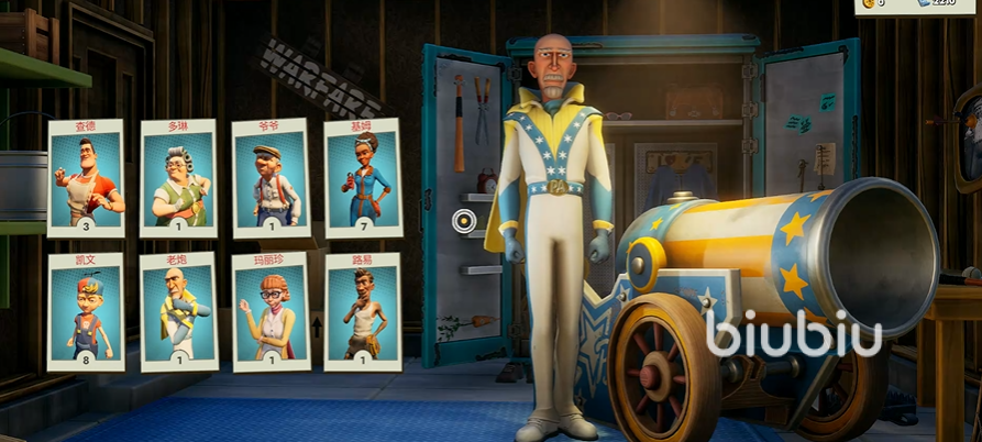 角色系统方面,初始可选四名角色(后续解锁凯文,以及新增的3名角色),每名角色拥有独特技能树。例如凯文凭借远程攻击、钩索位移和小体型建模成为偷家利器;偏好防守的玩家可选择老炮角色,通过“秦王绕柱”战术配合自动炮台实现持续牵制。角色5级后解锁专属被动技能,如拆家流可选建筑伤害加成,近战流可强化越战越勇属性。