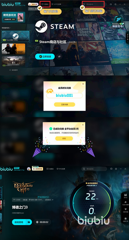 除了这些原因之外,卡顿最为主要的是网络的不稳定。要想有效更好的体验游戏,不如就选择一个网络加速器,在众多的网络加速器中,大家可以选择biubiu加速器,现在所有用户都可以领取免费加速时长,只需要在加速器的页面复制【biubiu001】就可以免费3天,新用户在注册之后还有一个24小时的加速时长,结合兑换码一起使用就可以免费96小时。