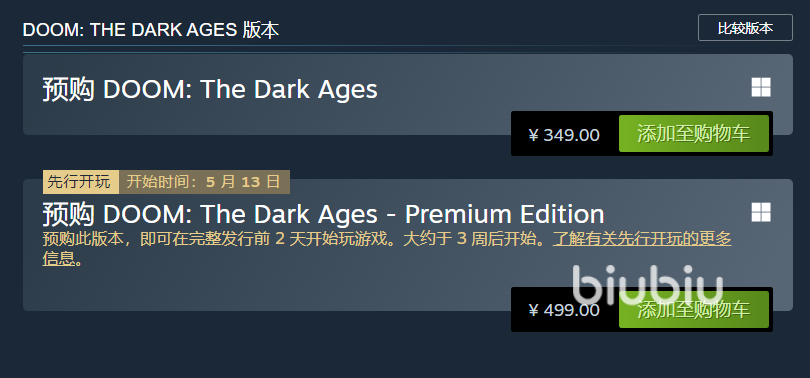 毁灭战士黑暗时代的标准版售价为69.99美元,Steam国区售价349元,包含游戏本体及部分预购奖励,而豪华版定价99.99美元,Steam国区售价499元,除了基础游戏外,还提供额外的数字内容,包括独家武器皮肤、角色外观、原声音乐以及未来推出的DLC扩展包。