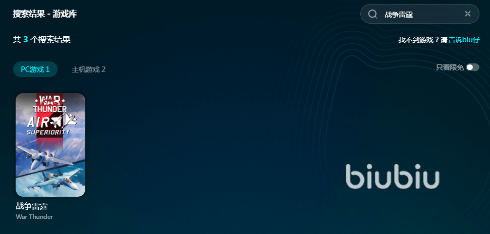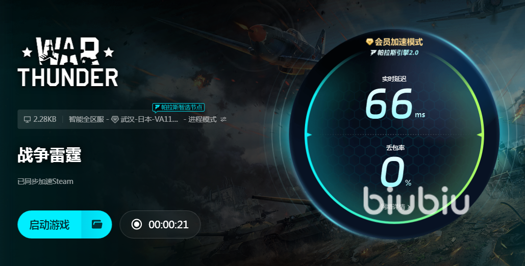 加速之前大家先在站内搜索战争雷霆,页面显示加速资源以后直接点击就能加速了。目前平台开放了主机游戏的限免加速权限,大家根据自己玩的端口自行选择就好。biubiu加速启动很迅速,不需要玩家选择节点,系统会自动分配好,省时省力更省心。