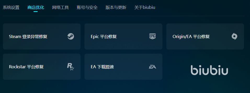 大部分玩家都是通过steam平台来玩战争雷霆的,如果你也经常玩steam,那么还可以使用biubiu里的商店优化功能。它可以优化修复steam登录异常、加速报错等问题,其余EA平台、Epic平台的登录报错也能修复,功能十分强大。有biubiu在大家再也不用担心玩游戏无法登录或者是网络卡顿了。