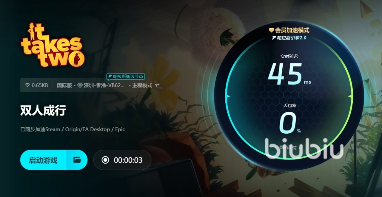 以上就是双人成行加速器哪个比较好用的分析内容,游戏想要2名玩家组队完成,在解谜时更是没有任何提示,可能还需要成员之间的沟通才能找到解谜的关键,所以队伍成员之间的沟通很重要。担心自己的网速不够的话可以启动下biubiu进行加速,加速前别忘了先来领取相关的免费加速福利。