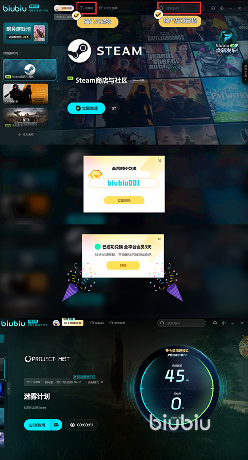 在这个残酷的世界中,玩家确实会感受到惊险刺激,但如果真的想要体验这一款游戏,别忘记还需要保证网络的顺畅。如果遇到网络卡顿等现象,那就需要选择加速器。新用户如果是第1次下载,在完成注册之后就有一个24小时的新手礼包。这并不是最终的时长,还可以在加速器的页面复制口令【biubiu001】兑换长达3天的免费加速时长,两种方法还可以叠加在一起使用。最终新用户免费的时间可以达到96小时。