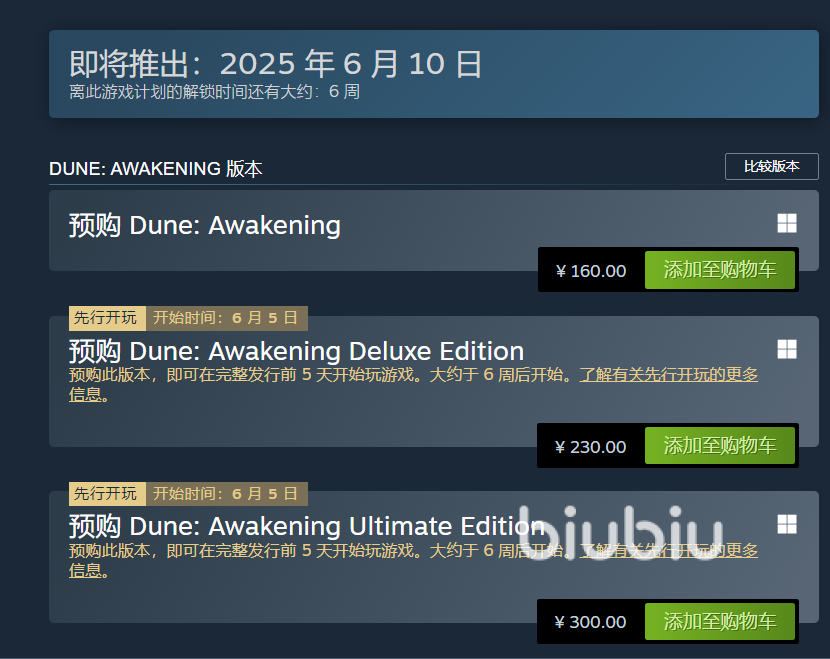 然后这个游戏的普通版价格为160,不过买了之后要在2025年6月10日才能开玩。要是大家想先行开玩的话,就要购入230元或者300元的版本,除了基础游戏之外,还可获得各种预购奖励。甚至还可以提前五天进入游戏,比其他玩家来说优势明显。在这里大家需要参与香料争夺与派系斗争,香料是核心资源,可用于交易、强化能力或成瘾,所以开服遇见了这种东西就要及时获取。之后还可加入厄崔迪或哈克南家族,参与服务器范围的权力斗争。