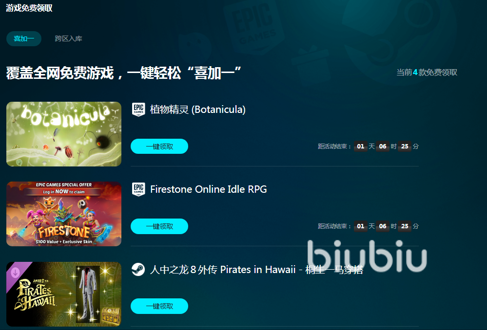 如果你经常玩steam游戏,平时也可以关注biubiu的免费游戏领取栏目,进入喜加一就能看到平台准备的免费游戏,领取很方便,系统也提供详细的领取教程,保证让大家0元领游戏,没有任何套路。