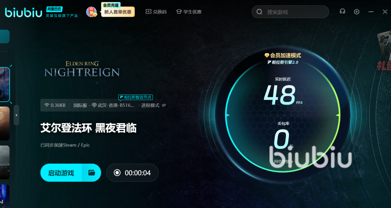 目前,biubiu加速器已支持多款热门游戏加速,新用户注册即可领取24小时免费加速时长。输入兑换码【biubiu不掉线】,还能额外获得3天加速权限,累计96小时的免费加速足以完成艾尔登法环黑夜君临的下载,并让大家好好的体验游戏。