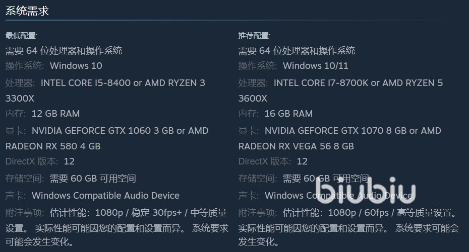 操作系统最低常规的Win10即可,处理器因特尔i5-8400,RAM需达到12GB RAM,显卡AMD580。此外,存储空间60GB,需要提醒的是,以上配置仅能保证游戏在1080p分辨率下以中等画质流畅运行,具体表现可能会因设备配置和设置有所不同。